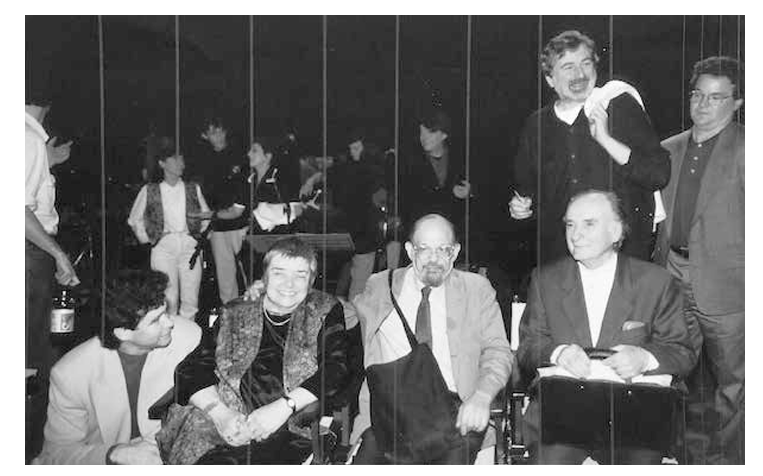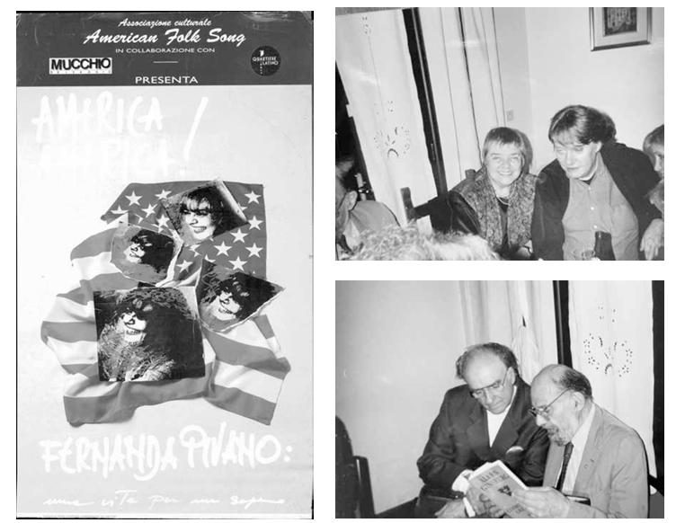 When she retired, she was celebrated at Coneglia no Veneto in June of 1995 with a two-day «Tributo a Fernanda Pivano»[33]. Distinguished participants in this event included Fabrizio De André, Allen Ginsberg, Francesco Guccini, Jay McInerney, Pivano, and Andrea Zanzotto, among others. In the photographs that follow, we see her during a moment at dinner with Fabrizio De André before going on stage for the Saturday evening encounter involving speeches, poetry, music and translation. She delivered her remarks on this occasion to a packed theatre. In other photos, Zanzotto and Ginsberg are seen at the same dinner, on June 10, 1995. The two poets were overheard conversing in French. Back in 1981, Zanzotto had this to say with regard to Allen Ginsberg, England, America, poetry, young people, and popular music:
